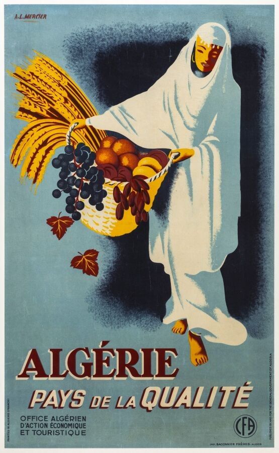 Tourism - A. L. Mercier (XX) - Algeria, Land of Quality. Circa 1930. 98,5x60cm. Printer Baconnier, Algiers. Original poster, lithograph, canvas covered. Condition A- very slight folds. This poster highlights the country's agricultural wealth. An Algerian woman carries a basket overflowing with local produce, oranges, dates, grapes and wheat, like a cornucopia.