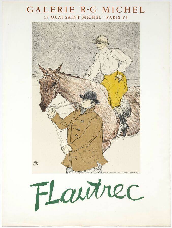 Exhibition - Henri de Toulouse Lautrec (1864-1901) after - Lautrec, Galerie Michel. 1954. Printed by Mourlot. 65x49cm. Original poster, lithograph, not canvas-backed. Condition A. The poster repeats the work "Le jockey se rend au poteau" of 1899. A large part of Lautrec's work focuses on horses and horse racing.