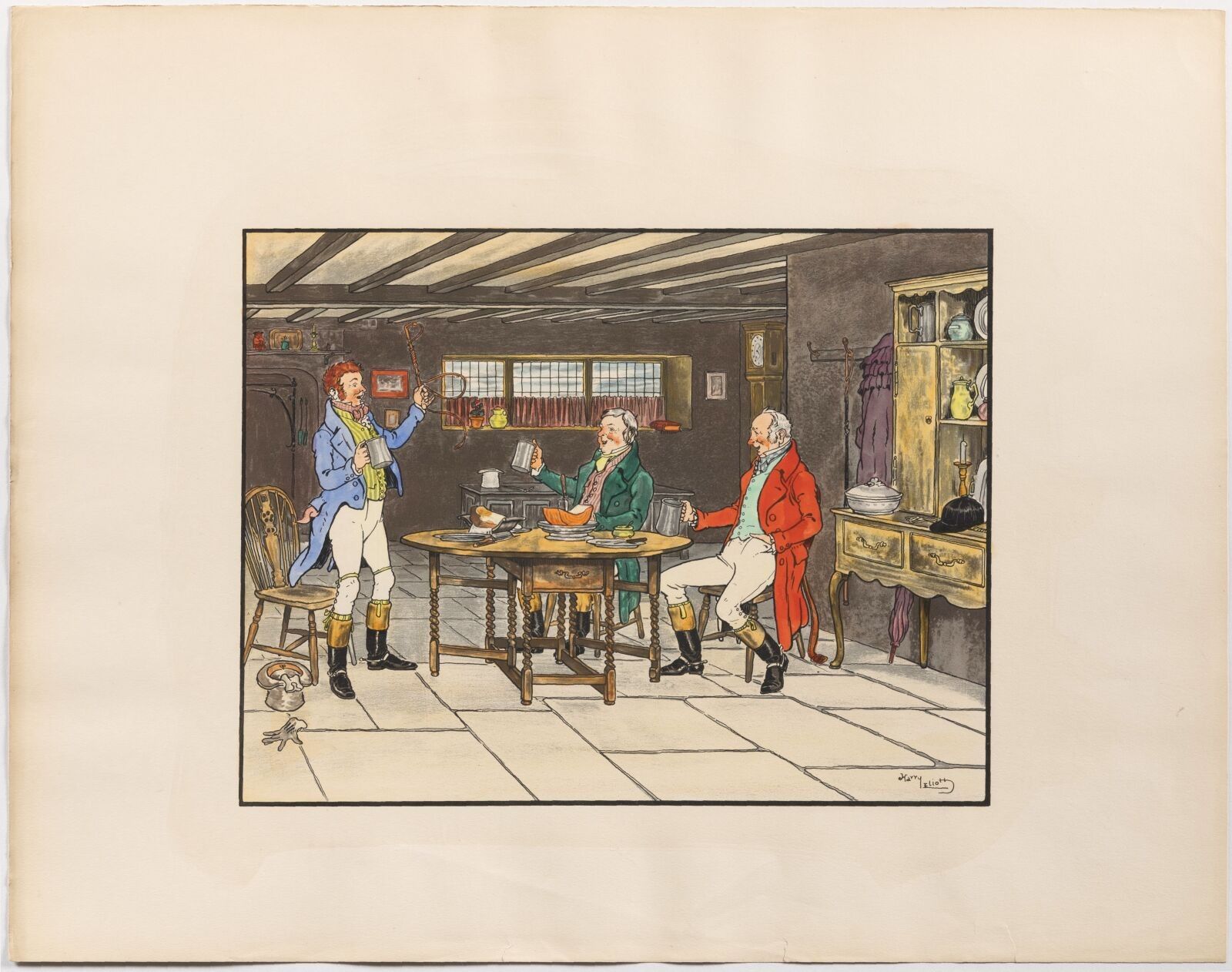 Artist - Harry Eliott (1882-1959) - Returning from hunting in England. Circa 1900. Original lithograph enhanced with brush and watercolour by the artist on ivory wove paper. Signed in the plate. All margins. The plate : 30x40 ; The sheet : 50x65cm.