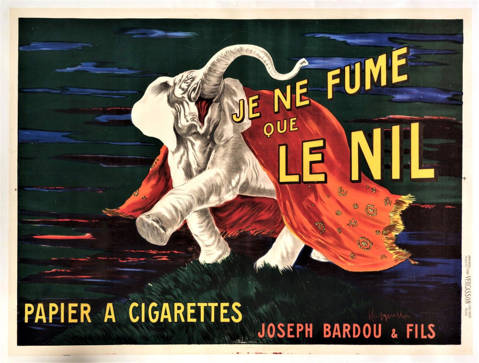 Tobacco - Leonetto Cappiello (1875-1942) - I only smoke The Nile. 1912. Printed by Vercasson. 159.5x117.5cm/ 62.7x4.3in. Original poster, lithograph, not canvas-backed. Condition A-. The Bardou heirs owned the "Job" brand of cigarette paper. In the 1870s, they relocated part of their production to Egypt, which gave them the idea of creating the "Le Nil" brand. If the Charente company has always flourished, it's partly thanks to the strength of their poster campaigns, produced by the great artists of the day. But it wasn't until 1912 and this poster by Cappiello that the brand became iconic thanks to this elephant.