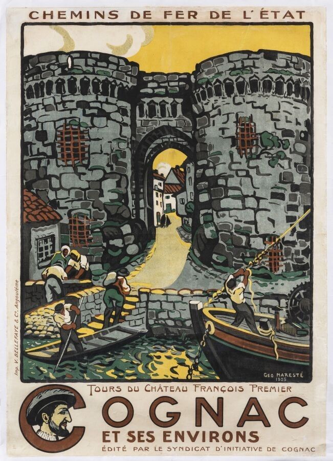 Tourism - Georges Maresté (1875 - 1940) - State Railways, Cognac and the surrounding area. 1925. Printed by Bellefaye, Angoulême. 105x74.5cm. Original lithographed poster, canvas-backed. Condition B, with restorations in the margins. The poster depicts the life of the boatmen at the foot of the Porte Saint Jacques, overlooking the river Charente. A small mascaron featuring the profile of François I is also displayed, reminding us that it was in this town that the emblematic King of France was born. The Musée de Cognac organised a retrospective exhibition on Maresté in 2010.