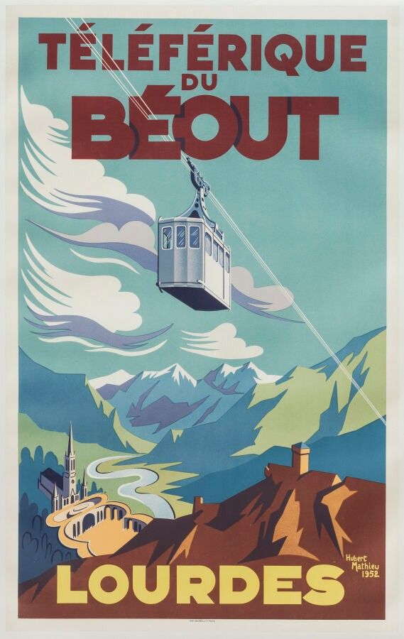 Tourism - Hubert Jean Mathieu (1897-1954) - Béout cable car, Lourdes. 1952. Printed by Bedos. 100x62,5cm. Original poster, lithograph, canvas covered. Condition A. Although the town in the Hautes Pyrénées is still a famous tourist destination, the purpose of this cable car was not to fly over the town, but to allow tourists to go to a viewpoint and visit a chasm in the neighbouring town of Ossen. The cable car was in operation from the 1930s to 1990.