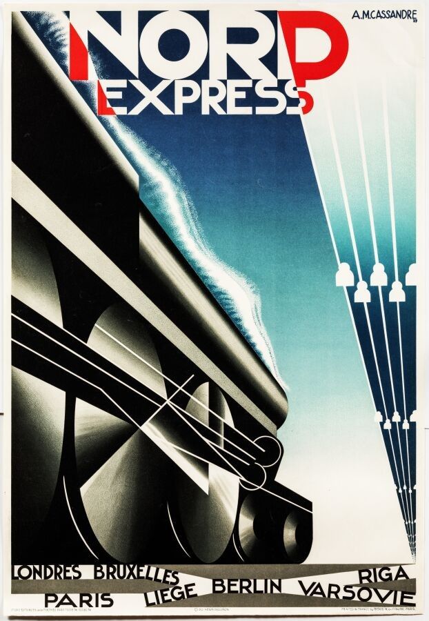 Tourism - Adolphe Mouron Cassandre (1901-1968) after. Nord Express. London, Brussels, Paris, Liège, Berlin, Warsaw, Riga. Printer Bedos Paris. 102,2x70cm. Original poster, lithograph. Condition A. This is the 1980 reprint, and one of the best-known visuals from the world of trains. Created by the Sleeping Car Company, the line's original aim was to link Paris with Saint Petersburg in Russia. With its growing success, the line expanded to include another service from London. This is what the artist has depicted at the bottom of the poster, with stations such as Brussels, Berlin, Warsaw, Liège and Riga.
