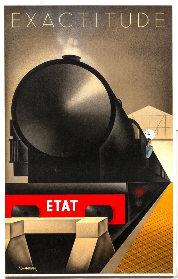 Tourism - Pierre Fix Masseau (1905-1994). Accuracy. Rebirth of 1982. Printer Bedos Paris. 99x62cm / 38,9x24,4in. Original poster. Lithograph. Condition A. This poster, originally created in 1932 by Fix Masseau for the SNCF, was republished by the artist himself in 1982. It is therefore not a copy, but a rebirth and an original poster. It features a monumental train locomotive at a station, in a composition similar to that of the Art Deco poster master Cassandre. The poster was originally produced for the Chemins de fer de l'Etat, which a few years later became the SNCF. An emblematic image of the train that continues to inhabit our imaginations, since it is this model of locomotive that is used to bring Harry Potter to Hogwarts.
