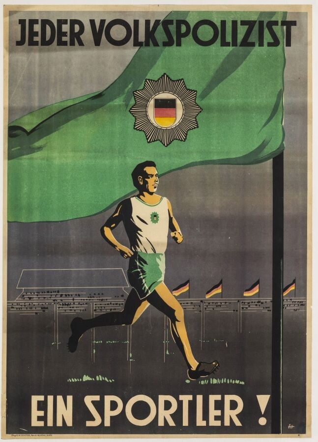 Tourism - Anonymous (XX) - Jeder Volkspolizist, Ein Sportler. Circa 1950 Printed by Schütze. 84x60cm. Original poster, lithograph, canvas-backed. Condition A-, marginal tears, text slightly soiled. The text reads: The policeman of all peoples, an athlete! This very rare poster shows the importance of the police in East Germany. The People's Police existed from 1945 to 1990, i.e. from the end of the Second World War in the Soviet-occupied zone. You can see its badge. It fulfilled the role of community policing and maintaining order, while working closely with the Stasi. It is interesting to note an aesthetic similarity between these posters and those of Communist propaganda in Vietnam. The sporting nature of our subject is perhaps an echo of the SG Volkspolizei Potsdam club (1948-1952), whose football section included a well-known player, Günter Schröter.