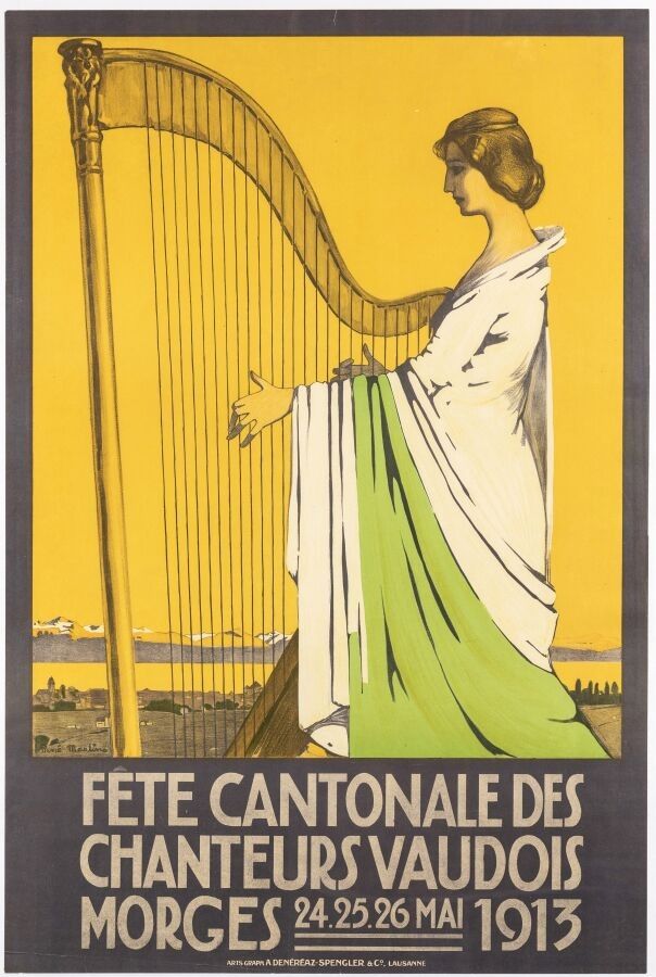 Tourism - René Martin (1891-1977) - Fête Cantonale des Chanteurs Vaudois Morges. 1913. Printer Denéréaz-Spengler & Cie, Lausanne, Switzerland. 101x68cm. Original poster, lithograph, canvas-backed. Condition A. German Art Nouveau, or Jugendstil, was at its height with this poster, which recalls the art of Berthon and even Mucha. The harp player evokes music in a highly unusual composition.