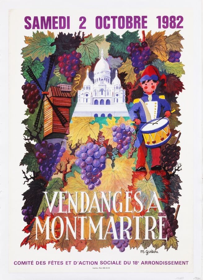 Drink - M. Guérou (XX) - Vendanges à Montmartre. 1982. Printed by Imprilux, Paris. 64x45cm. Original poster, offset, canvas covered. Condition A. The Sacré Coeur de Montmartre is at the centre of the poster, which features grapes and the galette mill. This festival, held to mark the harvest in Montmartre, was organised by the Comité des fêtes et d'action sociale of the 18th arrondissement of Paris, which continues to produce wine to this day.