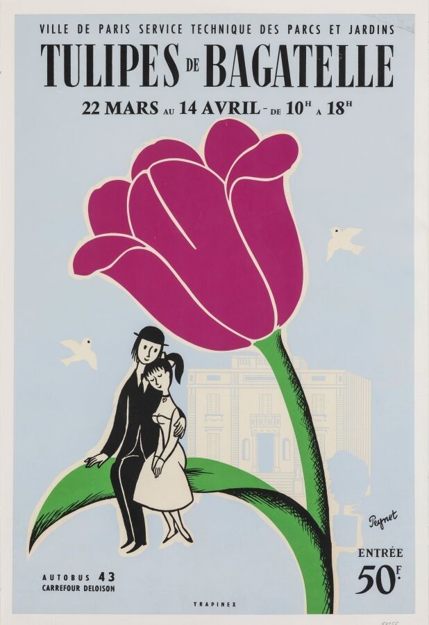 Show - Raymond Peynet (1908-1999) - Bagatelle tulips. Circa 1960. Printed by Trapinex. 59,5x40cm. Original poster, serigraphy, canvas. Condition A. Peynet's Lovers embracing seated on a tulip leaf. The Parc de Bagatelle is a park located in the 16th arrondissement of Paris in the Bois de Boulogne. The park and château of Bagatelle, also known as the "Folie d'Artois", were built in 64 days following a bet between Marie-Antoinette and the Count of Artois, who bought the estate in 1775.