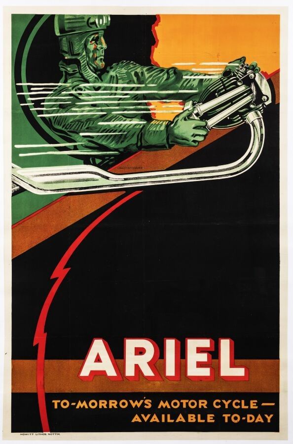 Automobilia - Anonymous (XX) - Ariel, To-morrow's motor cycle available to-day. Circa 1920. 148x97cm. Original poster, lithograph, canvas-backed. Condition A- restorations on folds. Ariel, a British cycle manufacturer, began producing motorbikes in 1901. In 1944, BSA bought the company, but the brand ceased to exist in 1970. This beautiful poster is extremely rare. The artist, who is undoubtedly talented, is on a par with Cappiello, Broders, Cassandre or Géo Ham.