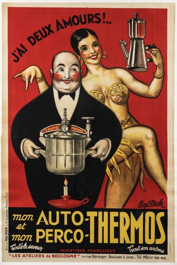 Food - Paul Mohr (1890-1959) - J'ai deux amours, Auto-Perco-Thermos. 1946. Printer Mohr, Asnières. 150x98cm. Original poster, lithograph, canvas-backed. Condition A-, one trace of vertical cut. Manufactured in Boulogne, near Paris, it is no more and no less than the ancestor of the pressure cooker. The poster also promoted a coffee maker with percolator, two revolutions in the world of the housewife who had two loves in her kitchen. At the end of the Second World War, it was all about selling. The image of Josephine Baker, reminiscent of the Roaring Twenties, could only help.