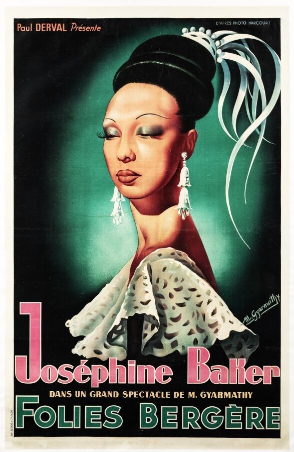 Show - Michel Gyarmathy (1881-1973) - Josephine Baker, Folies Bergère. 1949. Printed by Bedos, Paris. 148,5x95,5cm. Original poster, lithograph, canvas-backed. Condition A-, traces of original folds, traces of two small tears. The author of this poster is also the director of the show. Michel Gyarmathy, artistic director of the Folies Bergère, created this extraordinary and unique work of art from a Harcourt photograph. As the great expert Jack Rennert points out, this classic poster heralds Joséphine's legendary return to the Folies Bergère (in the Revue Féeries et Folies ) after the end of the Second World War. In the acclaimed biography "Joséphine: Le cœur affamé", authors Jean-Claude Baker and Chris Chase wrote of this period: "Joséphine wanted to offer Paris a new Folies-Bergère; there would still be naked girls, but Joséphine, the war heroine, would cover her body in thirty different costumes and embody many of history's famous women. She would be Eve, then Empress Josephine, and finally the unfortunate Marie, Queen of Scots" (p. 285).