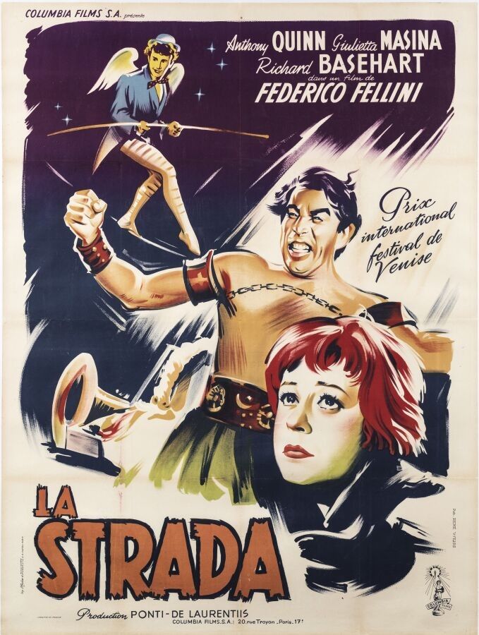 This poster is one of the two versions released for the film in 1955. This masterpiece of Italian cinema was awarded the Silver Lion at the Venice Film Festival in 1954. The cast includes Anthony Quinn, Guilietta Masina and Richard Basehart.