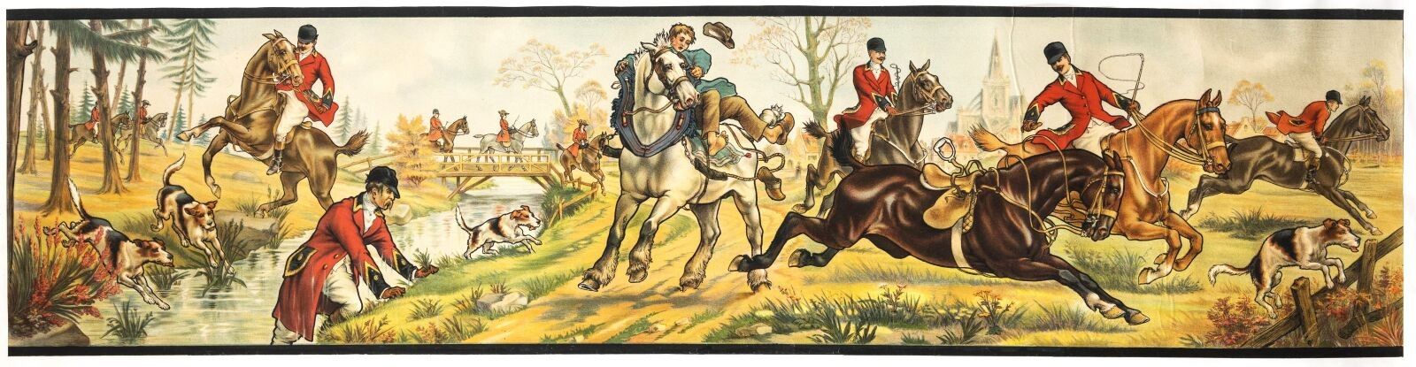 Artist - Frantz Charlet (1862-1928) - La chasse à courre, la chute dans le ruisseau. Circa 1910. 39x159,5cm. Lithograph, canvas covered. Condition A-, small traces of restored folds. The comic scene depicts a hunter who has fallen from his horse, overtaking a peasant on his draught horse.