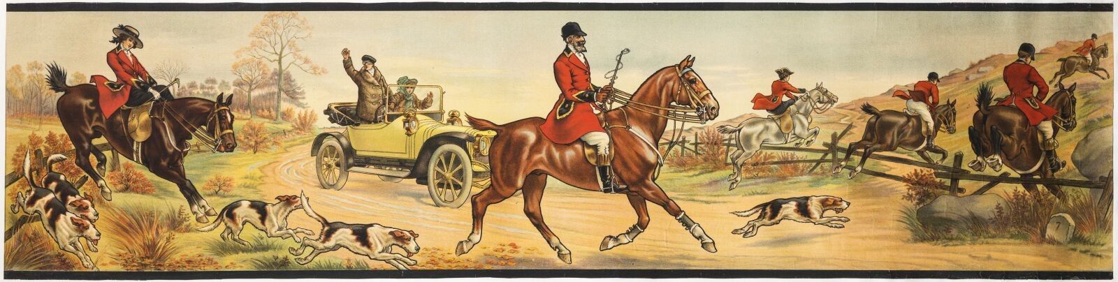 Artist - Frantz Charlet (1862-1928) - La chasse à courre, la voiture bloquée. Circa 1910. 39x159,5cm. Lithograph, canvas covered. Condition A-, minor traces of restored folds. The car shown is a Panhard Levassor.