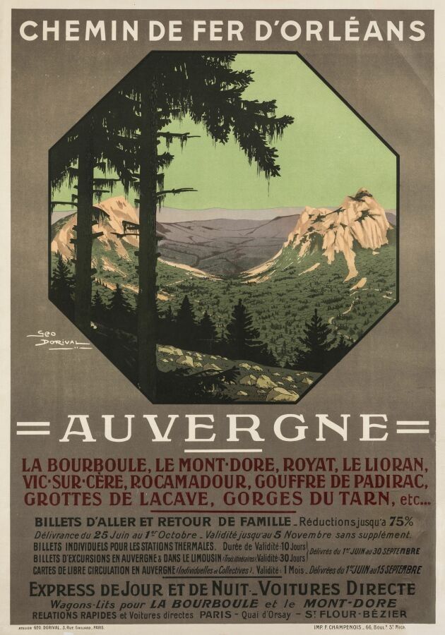 Tourism - Georges Dorival (1792-1968) - Chemin de fer d'Orléans, Auvergne, La Bourboule, le Mont d'or, Royat , Le Liorant, Vic sur Cère, Rocamadour, Gouffre de Padirac... 1911. Imprimeur Champenois, Paris. 102x72cm. Original poster, lithograph, canvas-backed. Condition A-, restoration to lower right corner. Puy de Dome, Cantal, Lot and Haute Loire served by the company.