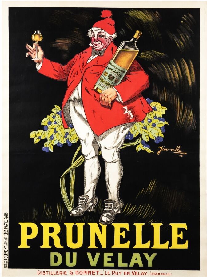 Boisson - Henri Jarville () - Prunelle du Velay. 1922. Printed by Courmont. 118,5x158cm. Original poster, lithograph, not canvas-backed. Condition A-, small marginal tears and losses, two small perforations. This is an alcohol produced by the Bonnet distillery in Le Puy en Velay, Auvergne. Haute-Loire.
