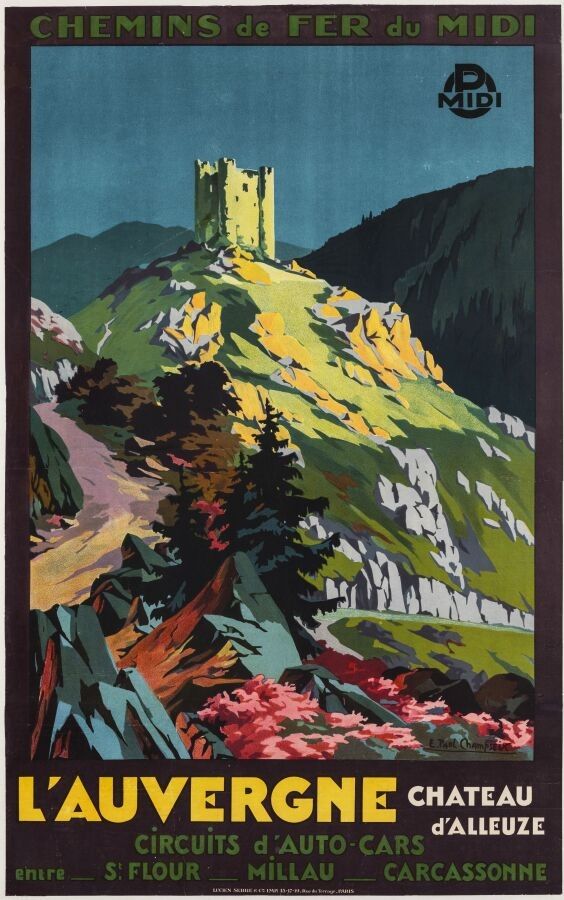 Tourism - Emmanuel Paul Champseix (1890-1983) - Chemin de fer du Midi. The Auvergne. 1929. 100x62cm, printed by Serre, Paris. Original poster, lithograph, canvas-backed. Condition A-, traces of folds. The Château d'Alleuze is a former medieval fortified castle in the French commune of Alleuze in the Cantal département, in the Auvergne-Rhône-Alpes region. The graphic treatment of this view is strikingly similar to certain works by painters from the Ecole de Crozant.