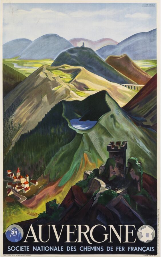 Tourism - Paul Martial (1928-1960) - The Auvergne. 1938. 100x62cm, printed by Paul Martial, Paris. Original poster, lithograph, canvas. Condition A. Long before Vesunia, the artist enjoyed depicting the volcanoes of the puys chain. The Auvergne region was also a French administrative region, grouping together the four departments of Allier, Cantal, Haute-Loire and Puy-de-Dôme.