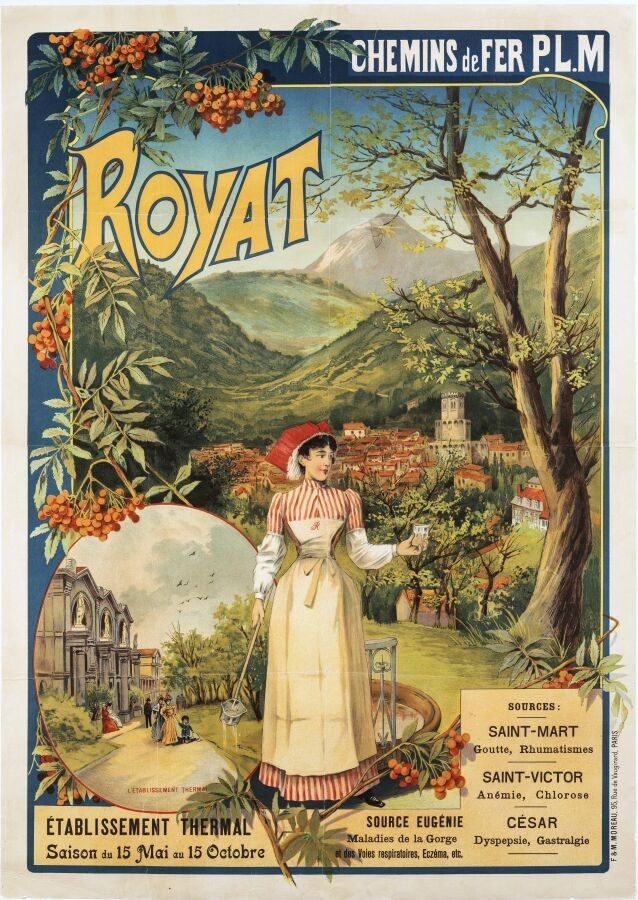 Tourism - Gustave Fraipont (1849-1923) attributed to - Chemin de fer PLM. Royat, Thermal establishment. Circa 1890. 101x72cm. Printer F & M. Moreau, Paris. Original poster, lithograph, canvas-backed. Condition A-, traces of folds. Royat is a French commune in the Auvergne-Rhône-Alpes region, more specifically in the Puy-de-Dôme département. To this day, it remains a renowned spa town.