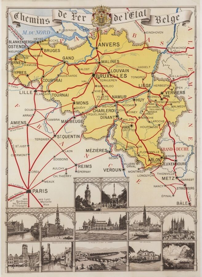 Tourism - Anonymous (XX) - Belgian State Railways. Circa 1890. 98x63cm. Printed by Goossens, Brussels. Original poster, lithograph, canvas covered. Condition A-, tiny traces of folds. The map signed E. Patesson, Uccle, Brussels, is decorated with vignettes showing Mons, Liège, Ghent, Brussels, Ostend, Antwerp, Tournai, Mechelen, Bruges, La Meuse, Spa and the Han caves.