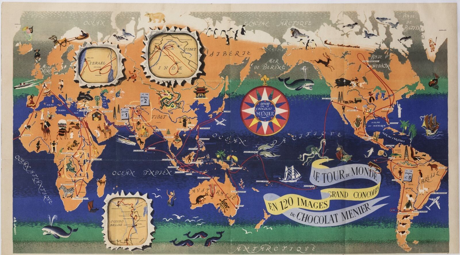 Food - J. B. Jannot (XX) - Around the world in 120 pictures, great Menier Chocolate competition. Circa 1950. 111x61cm. Original poster, lithograph, canvas covered. Condition A-, traces of folds, short lower margin. By evoking Jules Verne, the planisphere poster enabled children to discover the specific features of the world of the time. J. B. Jannot, who worked from 1940 to 1970 under the pseudonym Jan-Loup, was a French cartoonist and illustrator who worked in Paris during the mid-twentieth century. He was the author of famous comic strips for Lisette magazine, such as Le Trésor de la Crique aux Oursins, Les Naufragés de l'Île aux Crabes, Mireille de Camargue and La Jeunesse d'Arago. He has also adapted James Fennimore Cooper's The Prairie into a graphic novel. He has also created illustrations for children's books for the Collection Jean-François and for Éditions Fleurus.