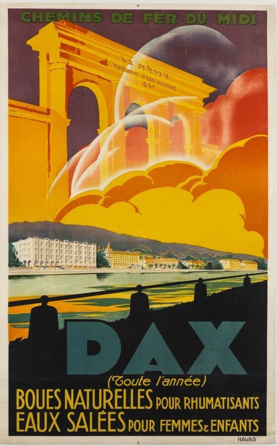 Tourism - Anonymous - Dax. 1929. 99.5x62.5cm. Printed by Havas. Original poster, lithograph, canvas-backed. Condition A-, two small marginal tears. The poster highlights this spa town in the Landes region of the Basque Country, famous for its La Nèhe spring, known since ancient times. It embodies the town's Gallo-Roman heritage and is an authentic emblem of the spa industry. The Art Deco view reveals the tourist infrastructure of the time on the banks of the Adour, in particular the newly-built Splendid hotel. It's a historic view, as only this building, fortunately listed, has survived the developers since.