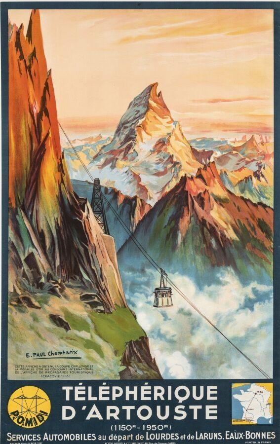 Tourism - Emmanuel Paul Champseix (1890-1983) - Artouste cable car, 1150m., 1950m. 1937. 99,5x62,5cm. Printed by Serre, Paris. Original poster, lithograph, canvas covered. Condition A. This poster shows a spectacular view of the Pic du Midi d'Ossau, evoking a tourist attraction at this ski resort in Béarn. In 1932, with the aim of stimulating tourism, the department's General Council proposed to the Compagnie des chemins de fer du Midi (CCM) that it exploit the panorama of the upper Ossau valley for tourist purposes. The request was sent to the Pyrénées-Atlantiques prefecture, which granted permission to open the site to the public. The convoy consisted of two or three wagons with wooden benches, pulled by Renault locomotives. It ran only on Sundays during the summer season. The company delegated its operation to retired train drivers. The poster won the Challenge Cup and the Gold Medal at the International Tourist Poster Competition, Krakow 1935.