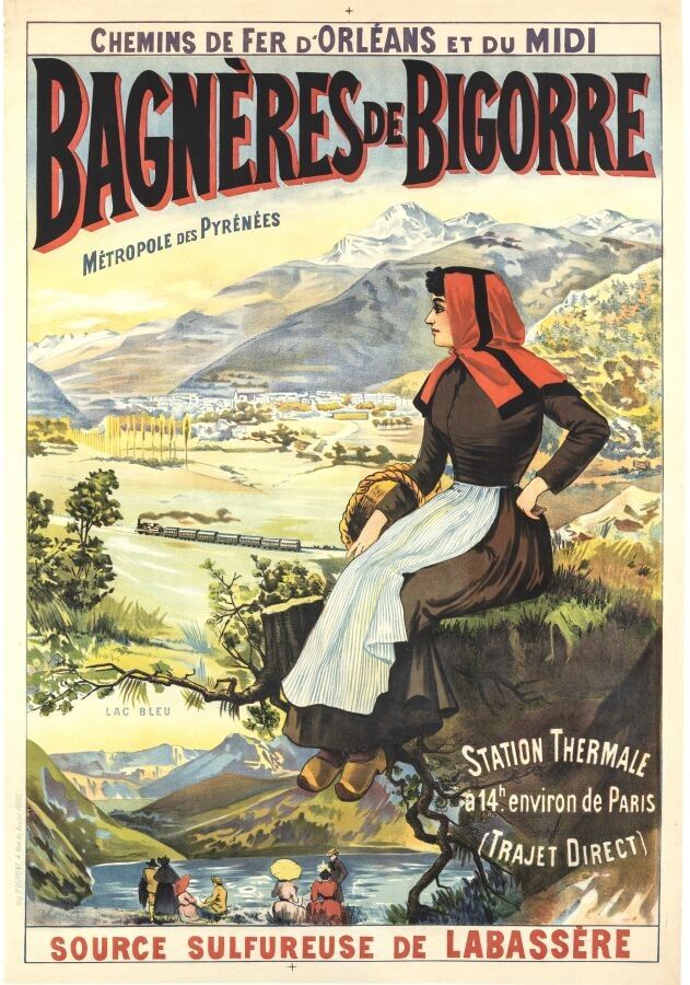 Tourism - Ulpiano Checa y Sanz (1860-1916) - Orleans and Midi Railway. Bagnères de Bigorre, Labassère sulphur spring. Circa 1897. 108x74.5cm. Printer Dupont, Paris. Original poster, lithograph, canvas covered. Condition A. The lower part of the poster shows elegant couples of tourists at the water's edge, while a Bagnèra woman in traditional costume, in the guise of the writer Philadelphe de Gerde, contemplates the Lac Bleu de Beaucens. It was the priest Jacques Pédefer who unearthed the spring in 1800, enabling the town in the Hautes Pyrénées to become a spa resort. In recognition of this, the town council had his bust sculpted and displayed in the town hall square.