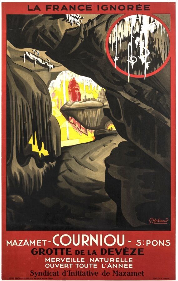 Tourism - G. Hebraud (XX) - Deveze caves in Mazamet. Circa 1925. Imprimerie Serre, Paris. 100X62cm. Original poster, lithograph, canvas-backed. Cond A-, traces of folds. Pretty poster for visiting caves in the Tarn department.