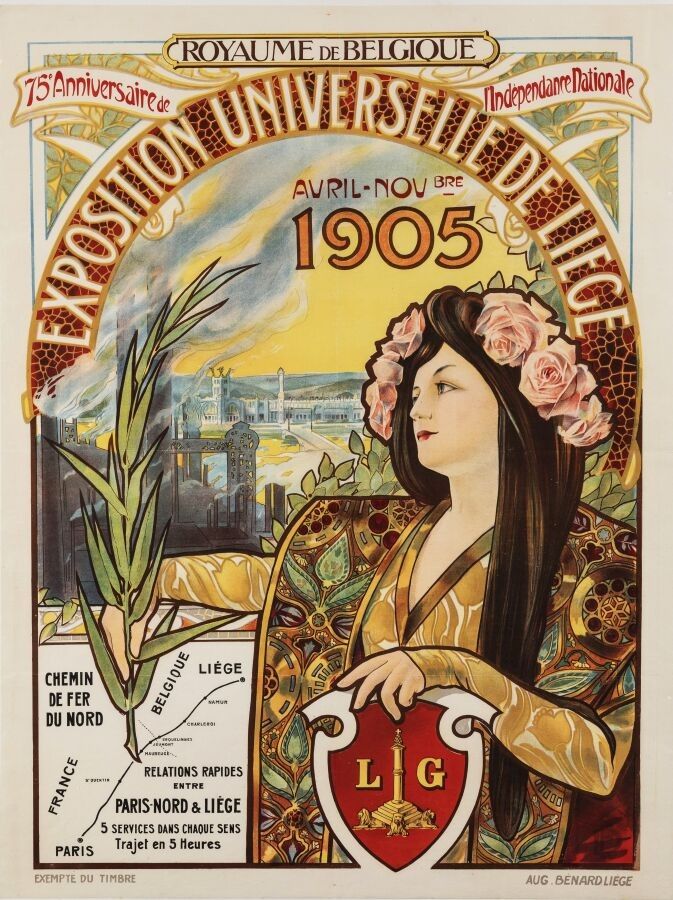 Tourism - Emile Dupuis (1866-1942) - Kingdom of Belgium, Liège World Fair. 1905. Printer Bénard, Liège. 107x80cm. Original poster, lithograph, canvas-backed. Condition A-, very small traces of the original folds. This exceptional art nouveau poster is of the same quality as those by Mucha, or the artist's compatriot, Privat Livemont. Symbolist in inspiration, it was the winner of the competition organised in 1903 to choose the official poster for the exhibition. As well as the realistic panorama that tourists could see from Cointe, we are also shown a map of the northern railway line that ran from Paris to Liège. A rare item.
