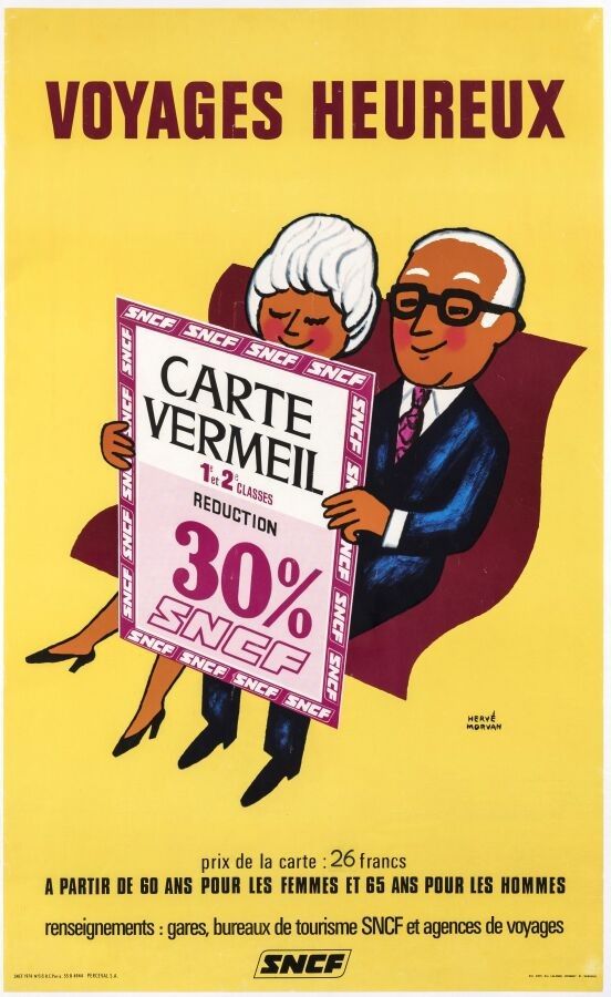 Tourism - Hervé Morvan (1917-1980) - SNCF, Voyages Heureux. 1974. Printer, Perceval, Paris. 101,8x61,5cm. Original poster, lithograph, canvas covered. Condition A. Born in Plougastel-Daoulas (Finistère) on 18 March 1917 and died in Paris on 1 April 1980, Hervé Morvan was a French artist specialising in illustration and poster design. He trained at the École supérieure des arts appliqués Duperré in Paris, where he gained a master's degree in mural art, frescoes and stained glass. He opted for advertising illustration as a career choice. He has designed over 150 film posters, as well as visuals for Gévéor wine, Gitanes cigarettes, Kelton watches and album covers for the Bordas sound collection (Corneille, Racine, Molière, Homère, Musset). He has also designed promotional posters for numerous artists, including Léo Ferré. He has two album covers to his credit, including La Chanson du mal-aimé (1957).