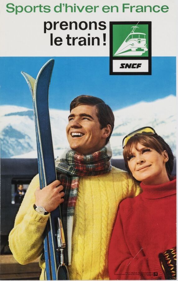 Tourism - Jean Claude Dewolf (1948-2019) - SNCF, winter sports in France, Let's take the train. 1968. 60x40cm. Printed by SNCF. Original poster, offset, canvas. Condition A. Reference : Bibliothèque Forney Cote : AF 152099. This poster perfectly illustrates the atmosphere of a luxurious ski resort: the Omega-style watch, the designer glasses and the colourful woollen knitwear, right down to the almost too neat haircut. That same year, in May and June 1968, Jean Claude Dewolf was taking part in student meetings to try out a new structure for the photography section of the school.