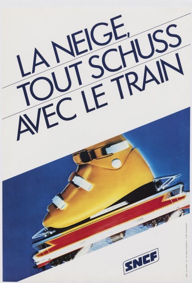 Tourism - Anonymous (XX) - SNCF, Snow with schuss with the train. 1981. 60x40cm. Printed by Duchaussoy. Original poster, offset, canvas covered. Condition A. The skier is equipped with a CC6500 locomotive in place of skis. Initially, Paul Arzens, the designer of the CC6500s, had given them a metallic grey, Capitole red and orange colour specially chosen to match the Grand Confort carriages for which they were intended. These trains were part of the French TEEs that represented the top of the SNCF range at the time. Arzens referred to this decoration as the "coup de soleil livery". From the 1970s onwards, the CC 6500s represented the apogee of French single-current locomotives and were the most efficient of their time. These locomotives represent the most powerful models in a vast line, later known as the Nez cassés. Versions of these locomotives were supplied to France and internationally between 1964 and 1999.