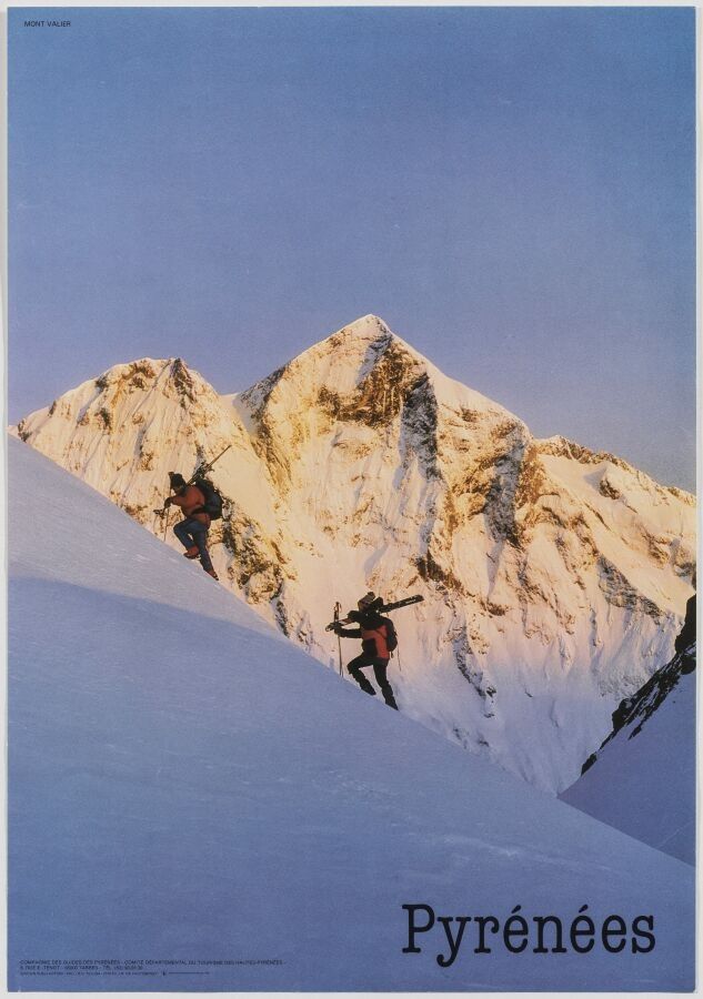 Tourism - Jean-Marc de Faucompret (1952-) - Pyrenees. Circa 1970. Printer, Éditons Graphiques, Pau. 59.5x41.5cm. Original poster, offset, not canvas-backed. Condition A. Jean-Marc de Faucompret explored the Pyrenees at a very early age through ski racing. At the age of 18, he discovered photography as a beach photographer. He then founded an advertising agency focusing on the tourism sector. He became passionate about building up a collection of photos dedicated to the Pyrenees. He was the sole author of the book Pyrénées: Montagne et lumières, in collaboration with photographer Didier Sorbé. This book, which sold 50,000 copies, would become a reference in the field of photography. This Compagnie des guides des Pyrénées poster shows Mont Valier.