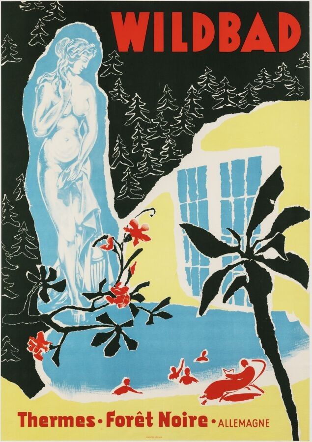 Tourism - Anonymous (XX) - Wildbad, Spa, Black Forest, Germany. Circa 1950. 85x59cm.printer, printed in Germany. Original poster, lithograph, canvas covered. Condition A. Until 1991, the town was known as Wildbad. In that year, it was given the name Bad ("bath"), in line with its reputation as a spa town. In the 19th century, Justinus Kerner described the benefits of its waters. The two most famous spas are the "Palais Thermal", a splendid art-deco spa, and the "Vital Therme", a complex of indoor and outdoor hot-water pools. Bad Wildbad is also home to a host of specialist clinics (rehabilitation, rheumatology, etc.).