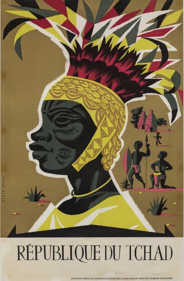 Tourism - Alain Cornic (1920-) - Republic of Chad. Circa 1950. 101.5x66cm. Original poster, lithograph, canvas covered. Condition A-, lacks in the margins of the text. Alain Cornic was a pupil of Jean Lurçat. He made wool tapestries at the Robert Four workshops in Aubusson.