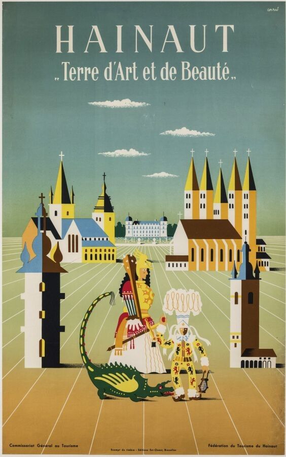 Tourism - Conrad (XX) - Hainaud, Land of art and beauty. Circa 1970. 95x63cm. Printed by Est-Ouest, Brussels. Original poster, lithograph, canvas-backed. Condition A-, traces of restoration on the margins. Hainaut, often referred to as the province of Hainaut (Dutch: Henegouwen; German: Hennegau), is a province in western Belgium within the Walloon Region.