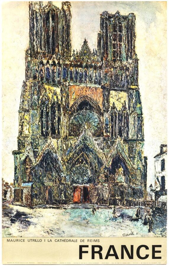 Tourism - Maurice Utrillo (1883-1955) after - France, Maurice Utrillo, Reims Cathedral. Circa 1955. Printer, Braun, Paris. 99x62cm. Original lithograph and offset poster, not canvas-backed. Condition A-, very small marginal folds. The painting photographed by Braun was in the collection of Professor Hadorn in Bern at the time this poster was published. The original painting was exhibited in Paris at the Orangerie des Tuileries in 1967, No.215 [Pétridès, I, 113], and no doubt this poster was printed to echo the success of the event.