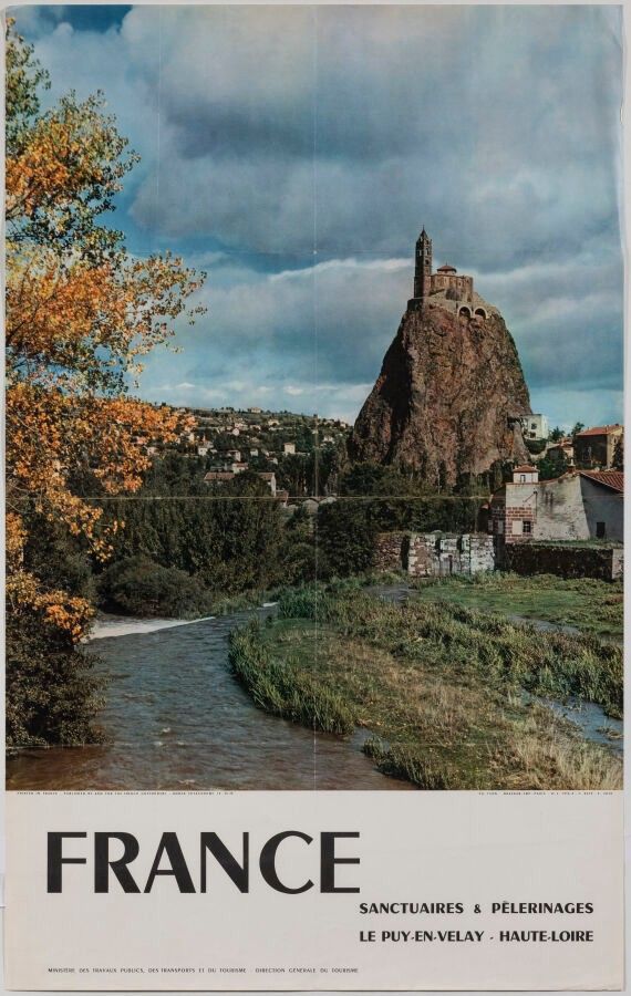 Tourism - Yvon (XX) - Shrines & Pilgrimages, Le Puy en Velay, Haute Loire, France. 1956. Printer, Draeger, Paris. 99x62cm. Original poster, Draeger process, not canvas-backed. Condition A-, traces of original folds. Le Puy-en-Velay is the prefecture of Haute-Loire, a department in the Auvergne-Rhône-Alpes region of France.