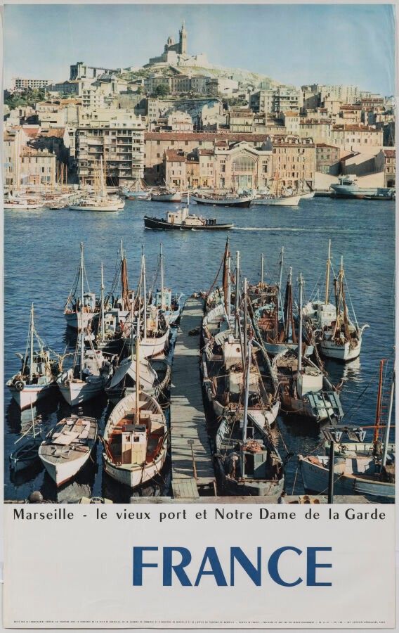 Tourism -Yan (XX) - France, Marseille, The old port and Notre Dame de la Garde. Circa 1955. Printer, Desfossés, Paris. 99x62cm. Original lithograph and offset poster, not canvas-backed. Condition A-, trace of folds. This spectacular shot is a trip back in time to the Bouches du Rhône. You can make out the 4cvs parked on the port.