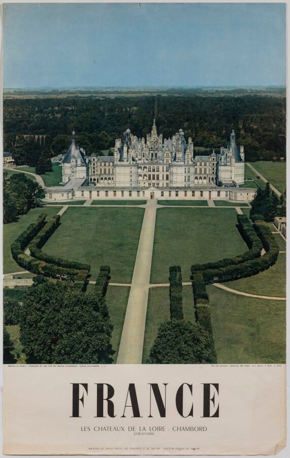 Tourism - Ray Delvert (1914-1992) - France, The chateaux of the Loire, Chambord, Loir et cher. 1956. Printer, Draeger, Paris. 99x62cm. Original lithograph and offset poster, not canvas-backed. Condition A-, traces of folding in the margins. Delvert was a pioneer in the field of aerial landscape photography. In 1958, he developed the "photo-finish", a device used to determine the winning horses at the finish line, which is now used at most racecourses.