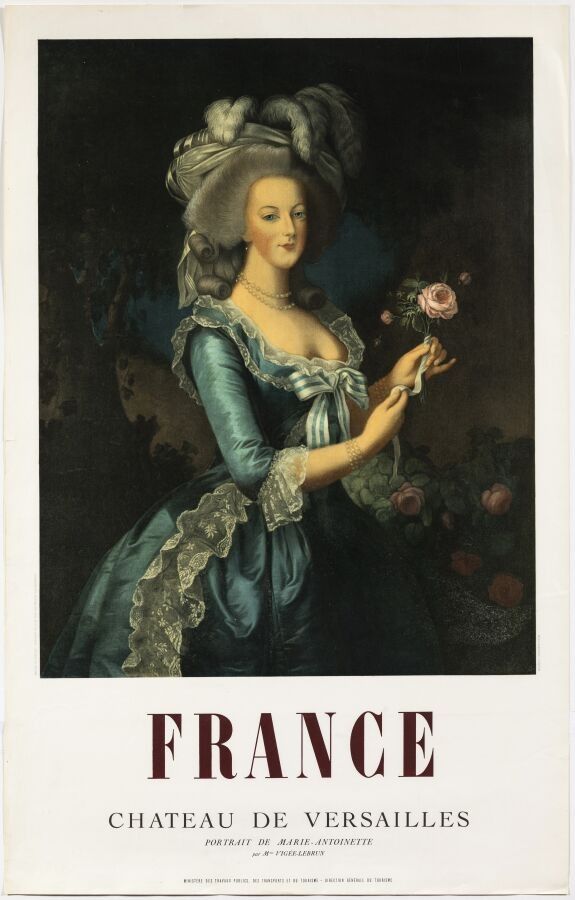 Tourism - Anonymous (XX) - France, Château de Versailles, Portrait of Marie-Antoinette by Mme Vigée-Lebrun. 1956. Printer, Mourlot, Paris. 101.5x64.5cm. Original lithograph and offset poster, not canvas-backed. Condition A. Marie-Antoinette à la rose is a famous painting of Marie-Antoinette, the French sovereign, by the French artist Élisabeth Vigée Le Brun, presented at the Salon de peinture et de sculpture in 1783. It is kept at the Palace of Versailles. The poster bears the words: Published by and for the French Government. It was therefore commissioned by the monarchy and reproduced by the Republic.