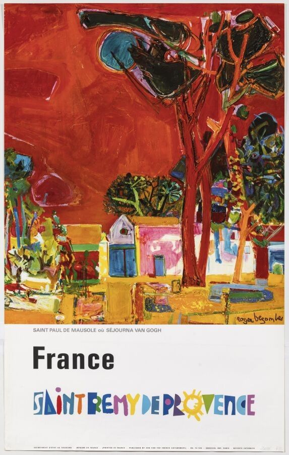 Tourism - Roger Bezombes (1913-1974) - France, Saint Remy de Provence, St Paul de Mausole where Van Gogh stayed. 1974. Printer, Draeger, Paris. 99x62cm. Original poster, Draeger process, not canvas-backed. Condition A. Beyond the advertising aspect, Roger Bezombes, with this poster, creates a vibrant tribute to Van Gogh.