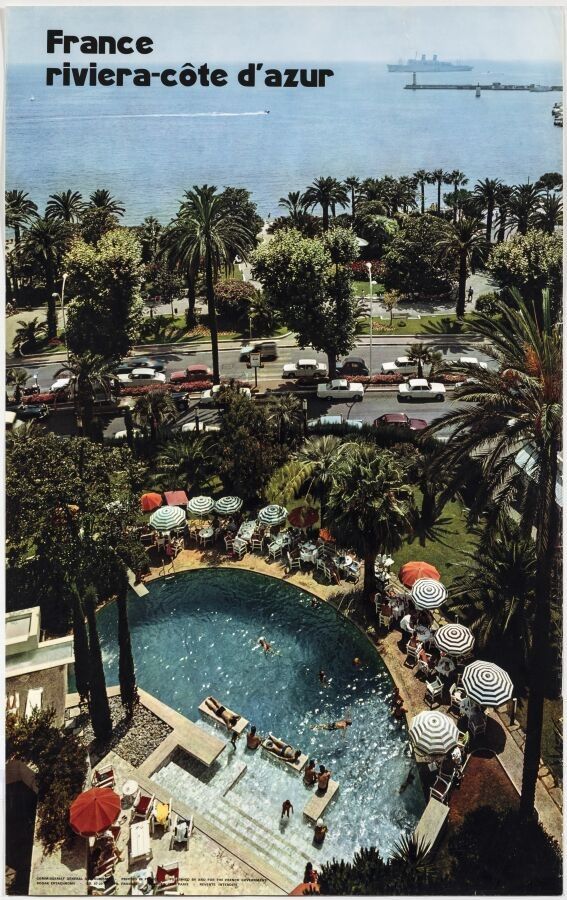 Tourism - Philippe Fronval (XX) - France, Riviera Côte d'Azur. Circa 1955. Printer, Draeger, Paris. 99x62cm. Original poster, Draeger process, not canvas-backed. Condition A- marginal tears. A bird's eye view of a hotel swimming pool on the Mediterranean, probably in Nice.
