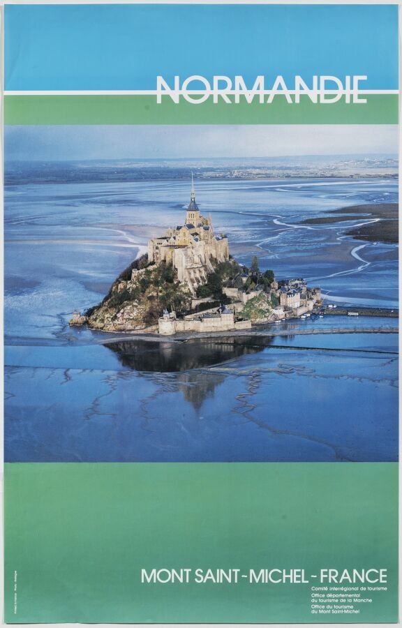 Tourism - Anonymous (XX) - Normandy, Mont Saint-Michel, France. Circa 1970. 99x62cm. Original lithograph and offset poster, not canvas-backed. Condition A. Rare view of the west side of Mont Saint Michel before the recent works. Département de la Manche.