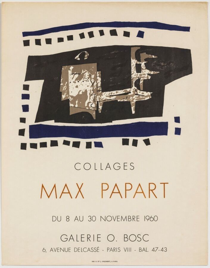 Exhibition - Max Papart (1911-1994) - Collage Max Papart, Galerie O. Bosc, Paris. 1960. Printer, Desjobert, Paris. 58x45,5cm. Original poster, lithograph, not canvas-backed. Condition A. Lithographic poster published for an exhibition at 6 avenue Delcassé in Paris. Max Papart is a Franco-American painter of international stature who is exhibited throughout the world and in numerous museums.