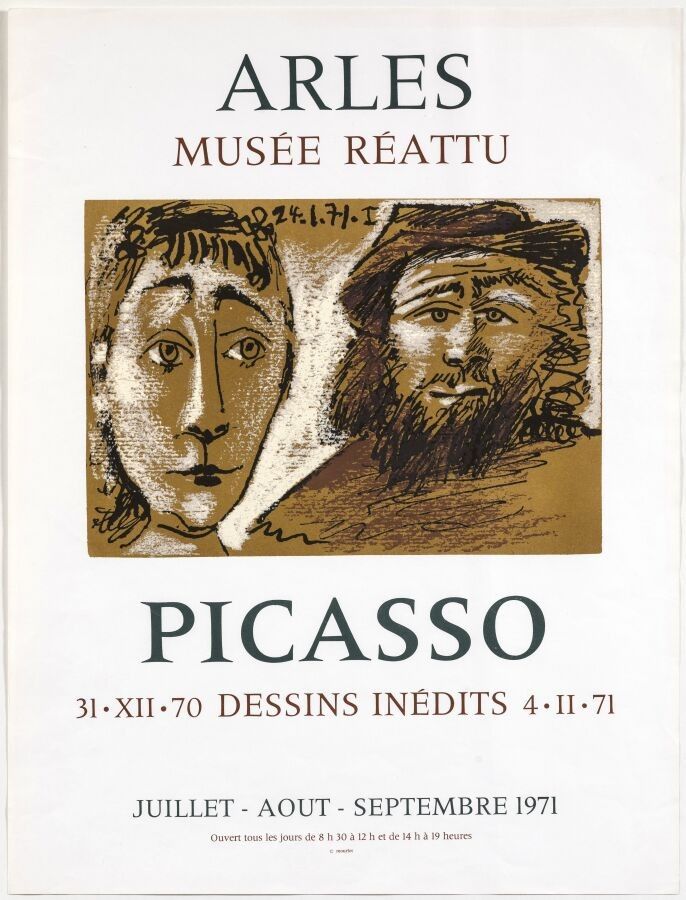 Exhibition - Pablo Picasso (1881-1973) - Arles Musée Réattu, Picasso, unpublished drawings. 1971. Printed by Mourlot. Original poster, lithograph, not canvas-backed. Condition A. 66 x 50 cm. Reference : Czwiklitzer 394. This poster comes from the collection of Mourlot's ink supplier, which explains why it is significantly larger than the dimensions given by Czwiklitzer. The Picasso Administration recounts the curator's visit to the Master: "Before my dazzled eyes passed an unimaginable series of veritable little recent masterpieces," says Monsieur Rouquette.