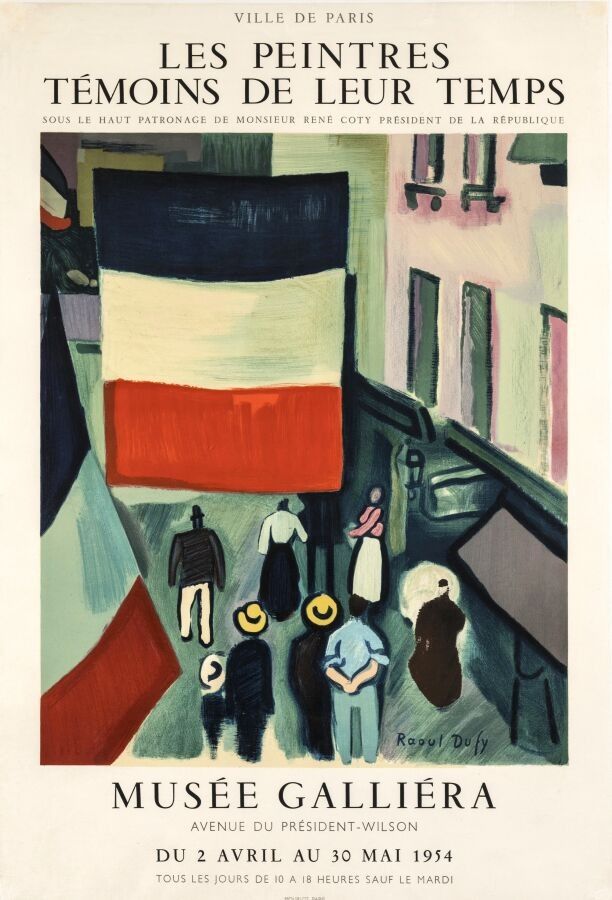 Exhibition - Raoul Dufy (1877-1953) - Les peintres témoins de leur temps, Musée Galliéra. 1954. Printed by Mourlot, Paris. 69,5x49,5cm. Original poster, lithograph, canvas-backed. Condition A-, 4 traces of perforations at the corners.