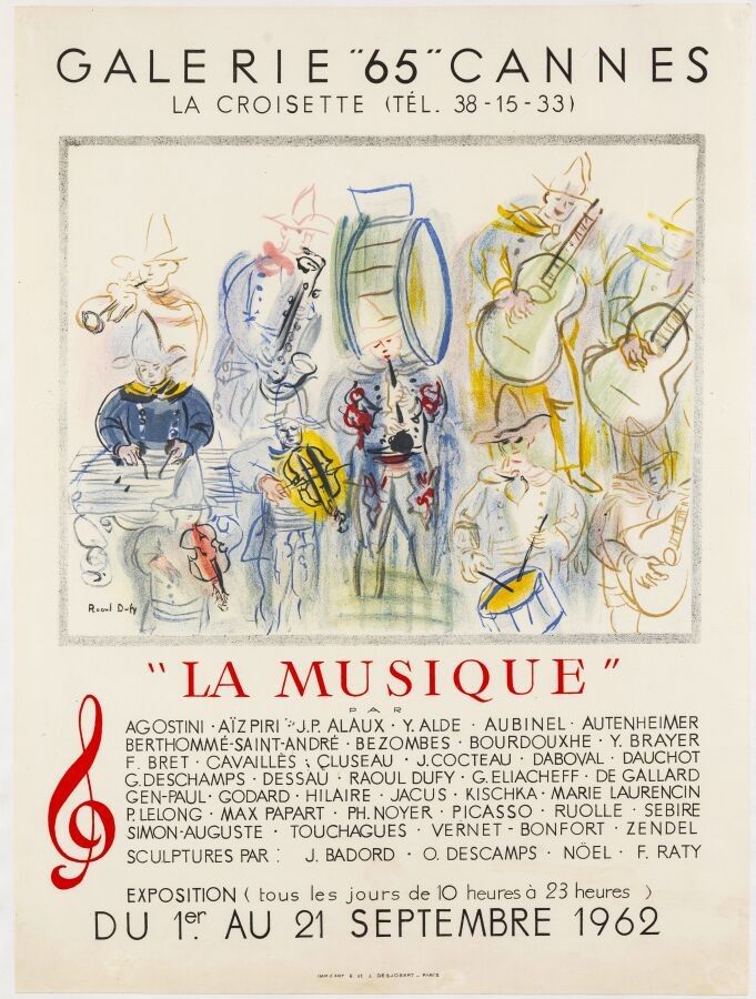 Exhibition - Raoul Dufy (1877-1953) - Galerie 65 Cannes, La Musique. 1962. Printer Desjobert, Paris. 66x48,5cm. Original poster, lithograph, canvas-backed. Condition A-, traces of perforations in the corners. This exhibition took place on the theme represented by the greatest artists of the time including Cocteau, Brayer, Gen-Paul, Papart, Picasso...