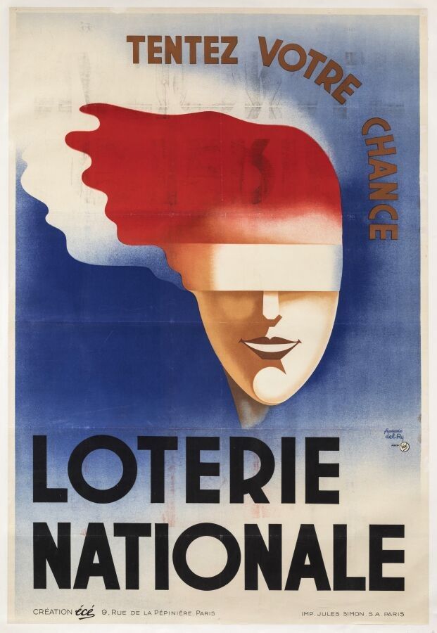 Show - François Del Ry (XX) - Try your luck, Loterie Nationale Circa 1938. Printer Simon, Paris. 121x80cm. Original poster, lithograph, canvas-backed. Condition B+, printing defect, traces of original folds. Beautiful Art Deco poster.